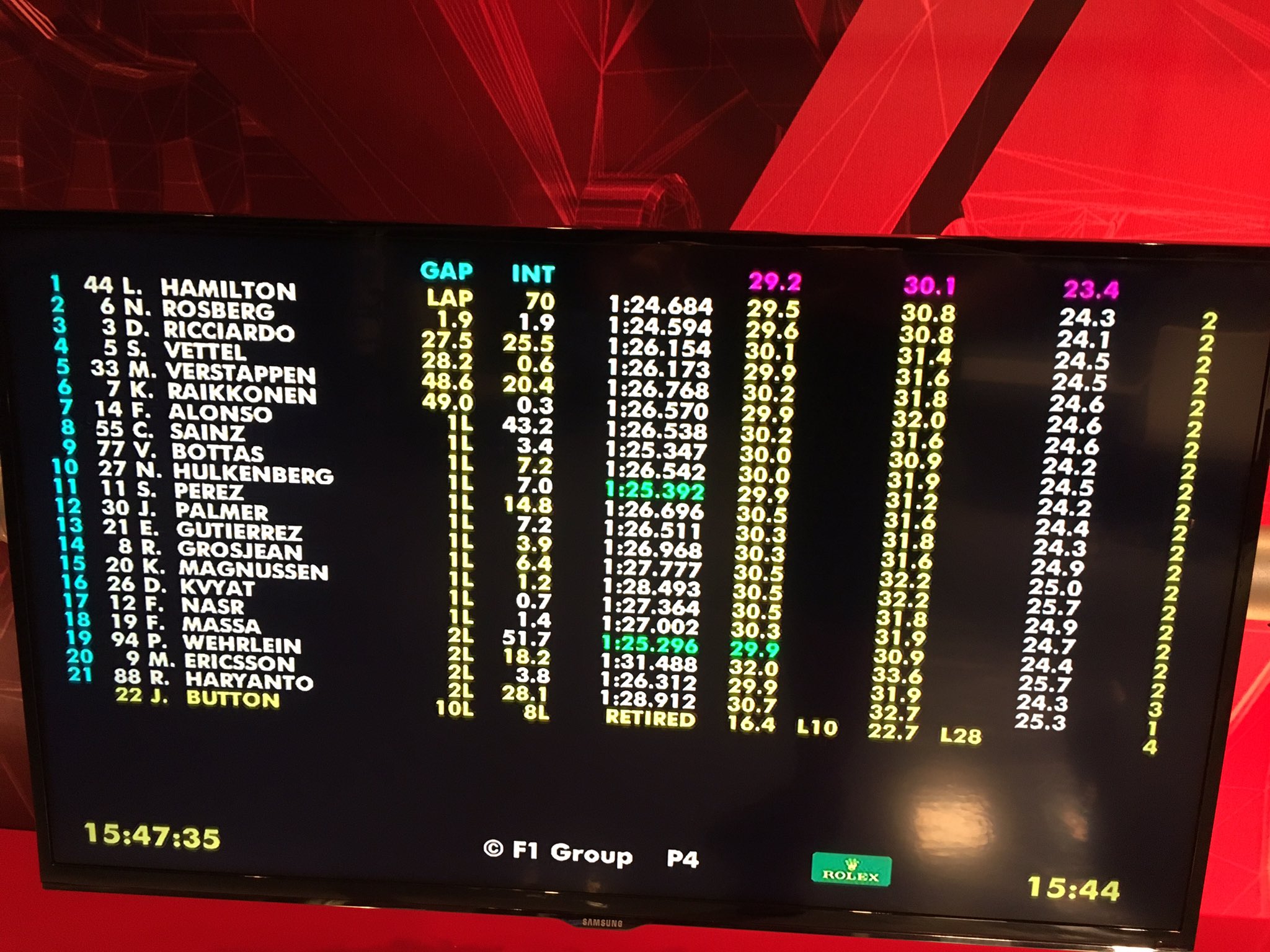 Entre as Mercedes, Nico não consegue chegar em Hamilton que mesmo sendo mais lento não recebe a ordem para devolver o favor de Mônaco. Embora, Nico esteja mesmo em um momento mais lento.
